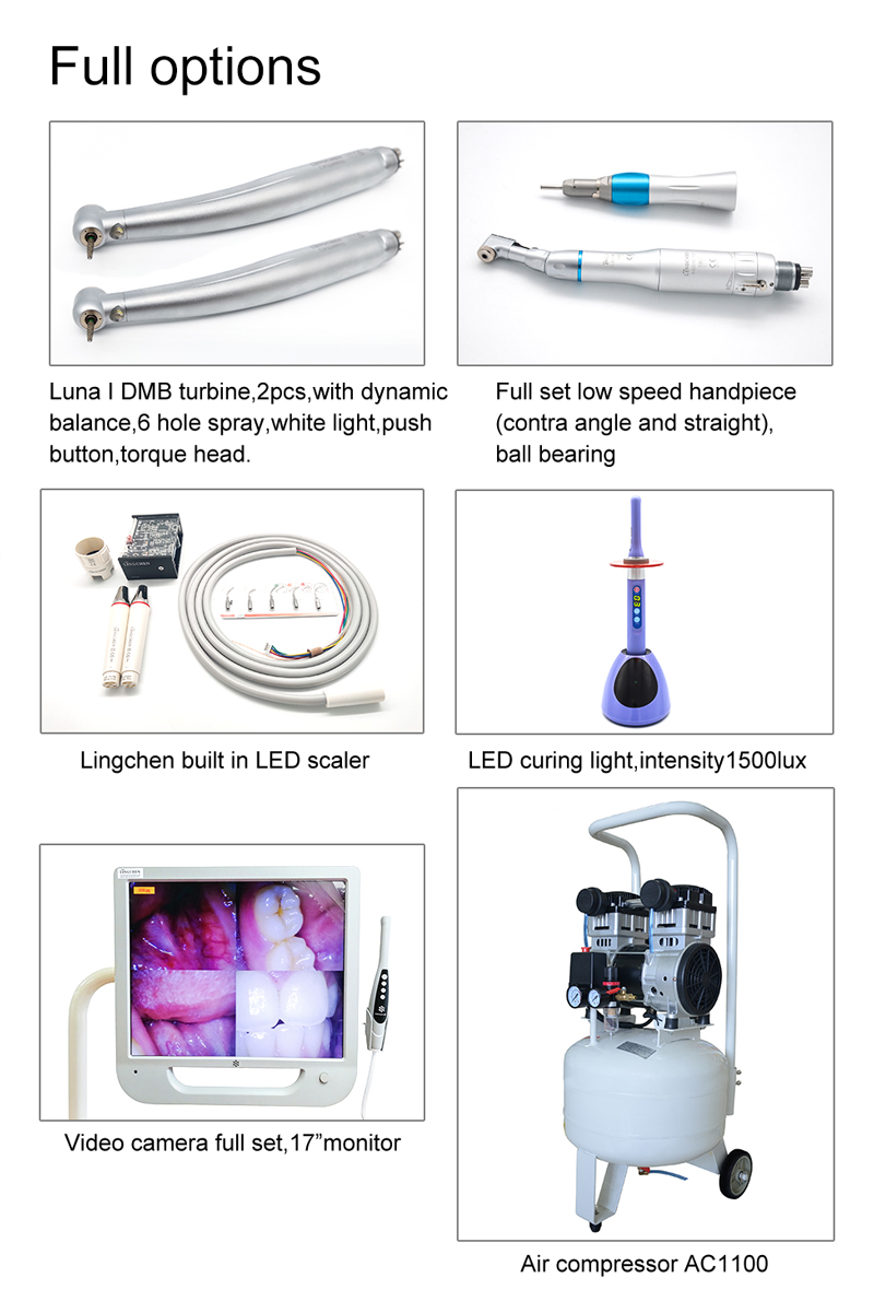 Air Compressor, built- in LED scaler, oral camera with screen, curing light, dental handpieces.